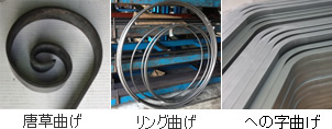 U曲げ、アングルリング曲げ、口曲げ、唐草曲げ、への字曲げ、リング曲げの他、鋼材や鋼板などの曲げ加工に対応致します。