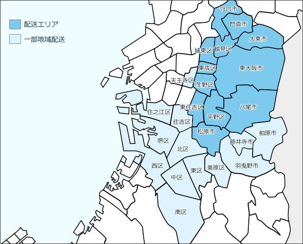 守口市、大東市、東大阪市、門真市、八尾市、松原市、城東区、東成区、生野区、平野区、東住吉区、鶴見区、堺市(堺区、北区、西区、中区、東区、南区、美原区)の一部、藤井寺市の一部、柏原市の一部、羽曳野市の一部、天王寺の一部、住之江区の一部、住吉区の一部